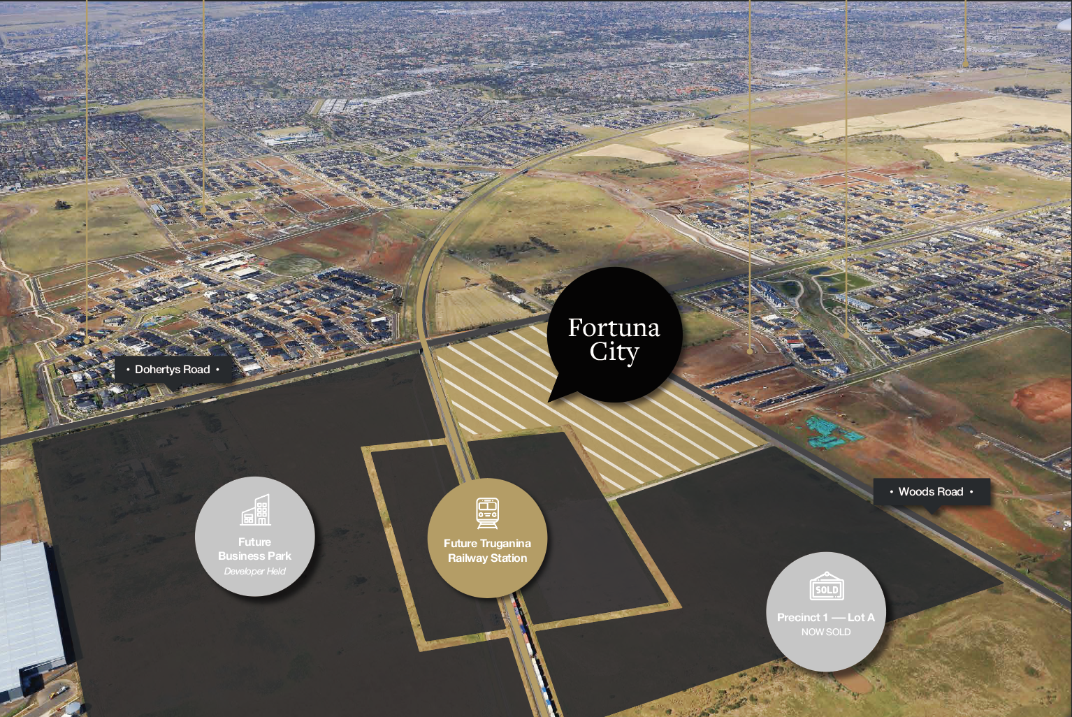 Fortuna City is planned for the Truganina area which is 23km west of the Melbourne CBD. It is adjacent to the proposed new railway station.